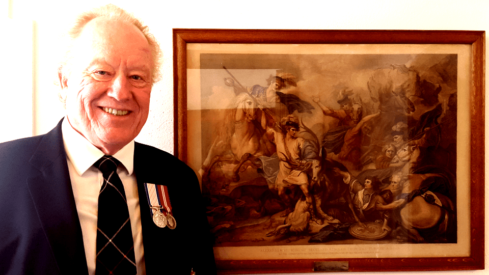 Also attached is a photo of me with a copy of a painting of the single most important moment in Clan MacKenzie history — our MacKenzie Clan Chief saving the life of the King of Scotland. It hangs in place of pride at the entrance to the Seaforth Officers’ Mess. In the Royal Art Gallery of Scotland on Princess Street in Edinburgh a painting of that scene hung in a place of extreme prominence floor to ceiling just inside the main entrance when I last visited.